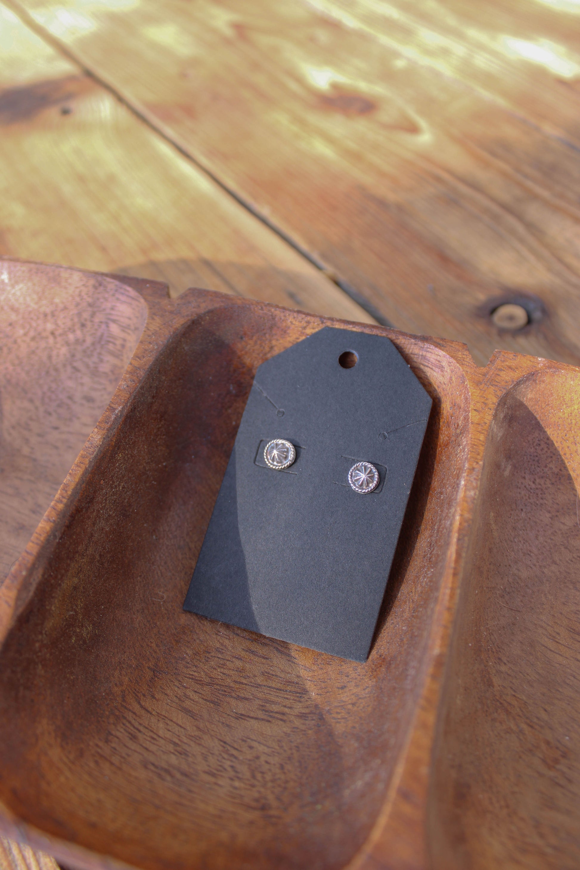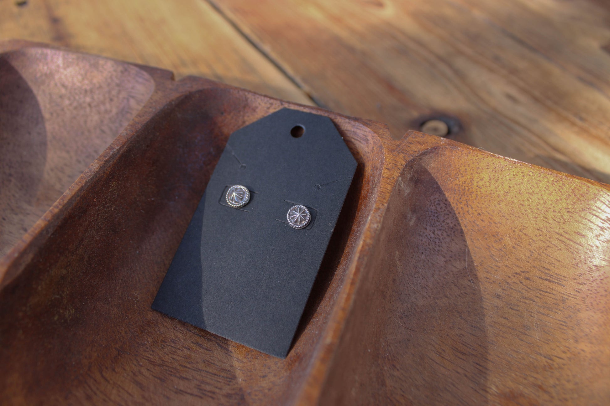 These dainty studs are made with .925 sterling silver and hand pressed sterling conchos. Perfect for everyday wear or to stack with other earrings.