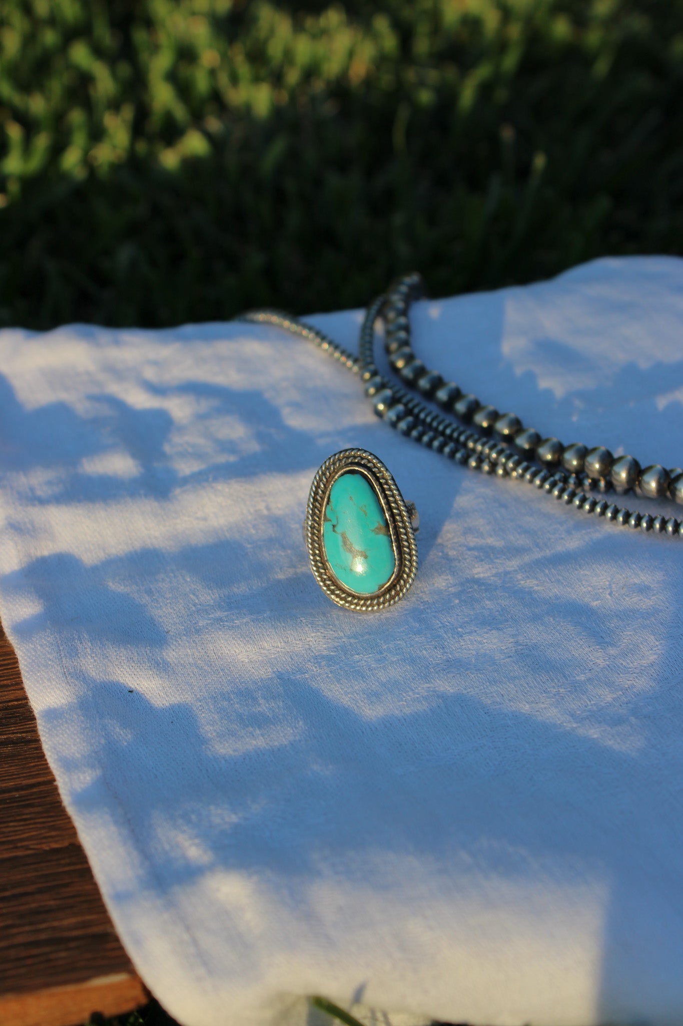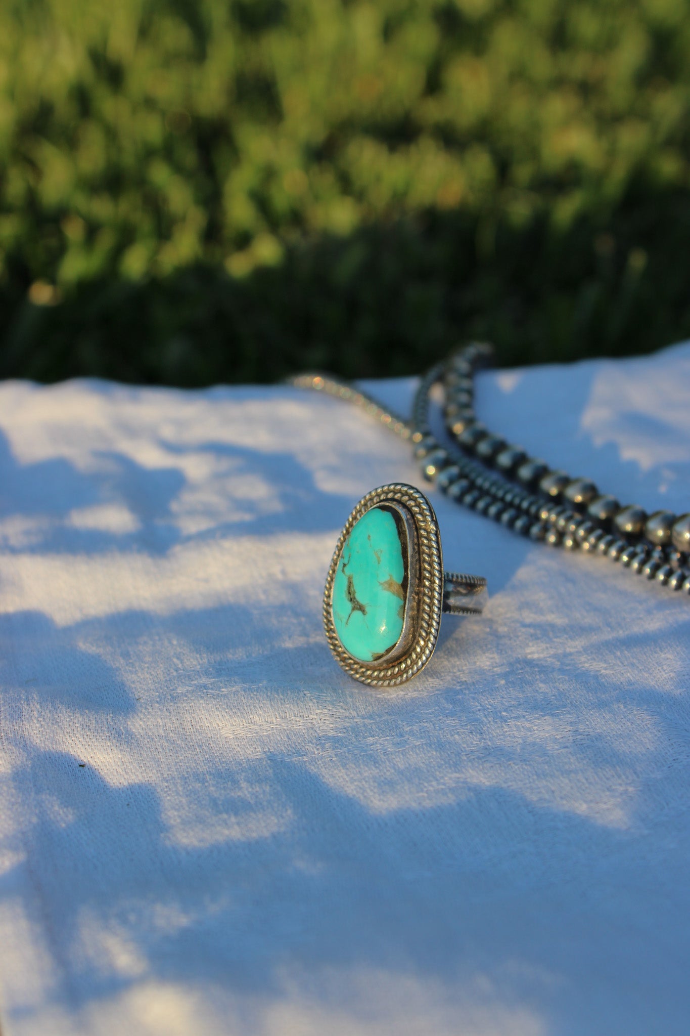This ring is made of Royston Turquoise and .925 sterling silver. The double rope wire detailing adds a unique touch to this piece, allowing for everyday wear or to dress up and wear as a statement ring! Size 7.75